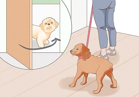 Put your current dog(s) away while you show the new dog around your home. Place your current dogs in one room and shut the door. With the new dog on a leash, lead it around your home so it can see where the food, water, and beds are. Show it where the outside door is and then take it outside to see where to go to the bathroom.
