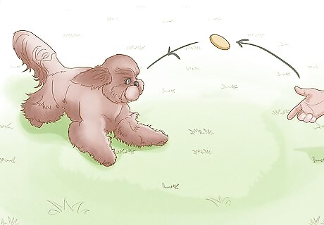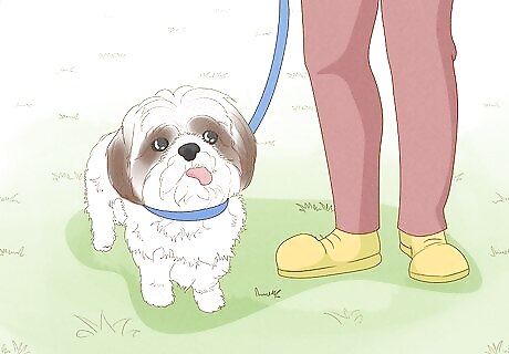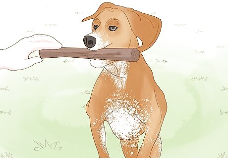 Toss a handful of tasty treats at an approaching dog. If a dog is coming toward you and you're not sure if it's friendly, you can use treats to slow down its approach. If you throw them toward the dog, they'll often stop to look around for more tasty morsels. Try chicken jerky for dogs, pieces of cheese, or other types of dried meat. Use the time to get you and your dog out of the way!