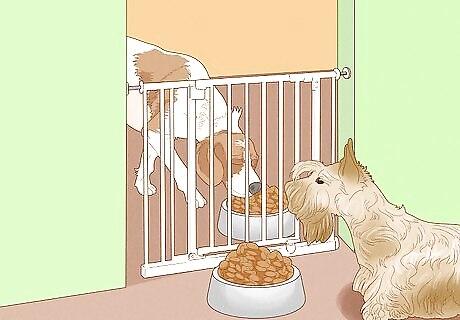 Move your dogs to separate rooms to feed them to calm aggression. If you have dogs who constantly try to steal each other's food and end up in nipping wars, then this may be your best option. Put them in rooms where they can't see each other and then feed them. This is also a good idea for when you're giving them treats or toys. If you know your dogs are going to fight over a treat or toy, take them to separate rooms. Make sure each dog gets something, though, as leaving one dog out will cause tension.