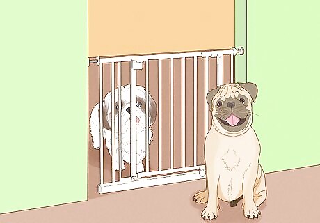 Keep your dogs separated for a few days. Put the new dog in a smaller room while giving your current dog or dogs the run of your home. That way, they can get acclimated to each other's smells through the door or baby gate. Plus, a smaller territory will help your new dog feel less overwhelmed at first. When you do allow them together, supervise them until you're sure they won't be aggressive. If you need to go out or if you're going to bed, put them in separate areas or crates so they can't fight. If they show signs of aggression or get overzealous while playing, keep them apart for 5-10 minutes before letting them try again.