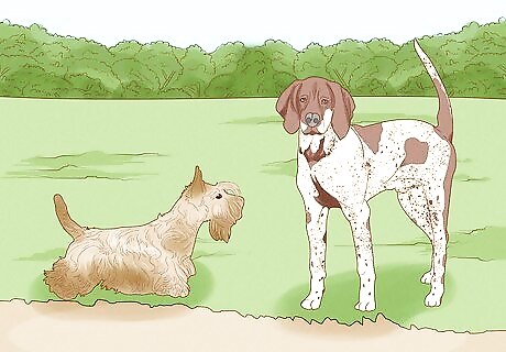 Allow the dogs to meet in a neutral location outside your home. Pick a place such as a park or someone else's backyard for your dogs to meet. That way, your current dog won't feel compelled to protect its territory. However, don't take your current dog with you when you go to pick up your new one. You won't be able to manage them both properly in the car. If you have more than 1 dog at home, have them each meet the new dog this way. Take them out one-by-one to meet the dog in a neutral location. That way, the new dog has a chance to get used to each one.