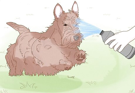 Squirt an approaching dog with water to startle it into stopping. Use a water bottle that has a pop-up lid since they squirt better. Then, when a dog comes your way that's not on a leash, squirt the water it in its face to keep it from getting too close to you and your dog. Just be sure not to drink all the water while you're walking! You could also use a small water gun or even a spray bottle if you prefer.