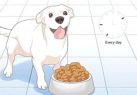 Feed your dogs 2-3 times a day on a strict schedule. Fights over food often stem from feeling insecure about it. To help tone that down, try spreading your dogs' food out over the day so they get to eat more often, as it reassures them you will continue to feed them. Also, make sure to use a set schedule. If they can predict when they will get fed, they will feel more secure about their food. Once your dogs are on a schedule, they will know when feeding time is. They will bug you until you feed them, so try to stay on time!