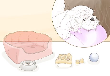 Gather up beds, food bowls, and toys in your home before bringing the dog home. If the new dog tries to take one of these toys, your current pups may get aggressive over them. It's best to start them out in a home free of these territorial possessions. You can give them back in a week or two, but provide new toys for the dog you're bringing home. In the meantime, let your current dogs play with their toys in a separate room. If possible, bring the dog's smell home first. That is, take a shirt or towel and rub it all over the new dog. Put it in your home in the area the dog will be sleeping and let your other dog or dogs smell it all over to get used to the scent.