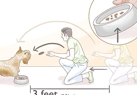 Discourage your dog from guarding its food by training it over time. Part of food aggression is territorially based, so your dog will want to guard its bowl. Start by standing 3 feet (0.91 m) away and asking the dog, “What do you have there?” in a conversational tone. Toss a small treat into the bowl after you talk to them, and repeat the process every few seconds. As the dog gets more comfortable, start taking steps closer to the bowl and feeding them treats. Once the dog feels safe when you’re near it while it's eating, try lifting the bowl away. Training your dog so it doesn’t guard its food can take a bit of time. Stay the same distance away and continue training if the dog doesn’t respond or is still aggressive while it eats. If your dog is still actively aggressive about its food, then seek professional help from a behaviorist to help.Warning: Be extremely careful since an aggressive dog could bite you. Don't do anything to provoke your dog into defending its food.