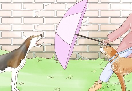 Hold an umbrella out to shield yourself and your pup from dogs. When a dog is coming your way and looking aggressive, this can be a simple way to buy yourself some time. Open the umbrella and hold it out in front of you. It won't keep a dog away for long, but it may be enough time for their owners to show up or for you to grab another distraction. Make sure to carry an umbrella with you at all times if you want to use this trick.