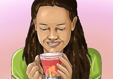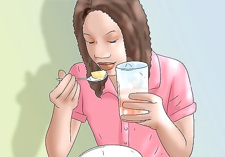 Drink small amounts of clear liquids. It's important to keep yourself hydrated when you are suffering from nausea or vomiting. Sip on cool, clear beverages throughout the day, such as teas or carbonated waters. You can also try fruit juices, except orange or grapefruit as they can cause stomach upset. Another way to get hydrated is to suck on popsicles or eat cold gelatin. While these contain only small amounts of fluids, these are a good way to maintain fluid intake when you're feeling unwell. In total, you should aim for 8 full glasses of fluids each day.