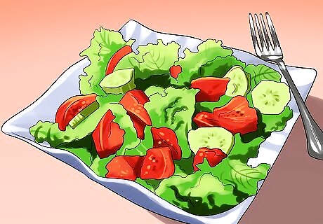 Eat small meals and snacks over the day. Consuming large, heavy meals can trigger nausea, as your body struggles to process all that food. Instead, try eating small meals and snacks every 4 hours over the day. You can even eat a high-protein snack right before bedtime to help you sleep more soundly. Stay within your daily calorie range when you snack. Snacks don't need to be high-calorie to be filling. Cheese, crackers, crudité, and yogurt are all great snacking choices.