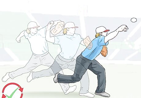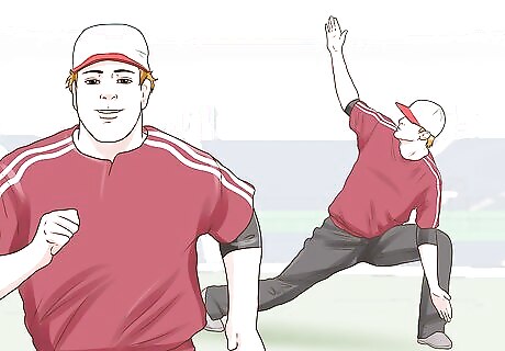 Stretch and warm up properly. A good pitching motion utilizes major muscle groups throughout the body, so time should be taken to loosen and warm up more than just your arm before taking the pitching mound. That said, warming up your arm properly is essential to warding off soreness and injury. Start with dynamic stretching, such as doing jumping jacks or jogging for three to five minutes, to get your blood flowing and loosen up your muscles. Move on to static stretching, gently stretching all your major muscle groups from head to toe and holding each stretch for about thirty seconds. Finally, begin throwing the baseball, starting with “soft toss” (easy throws at a short distance). Slowly increase the distance and velocity, and eventually move on to throwing some warm up pitches that approximate the intensity and conditions of throwing on the mound.