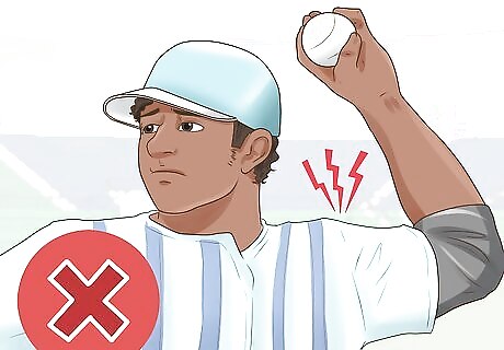 Don't pitch through pain or soreness. You'll sometimes hear professional ballplayers talk about pitching through a case of “dead arm,” which is vaguely defined as a general weakness that impacts pitching velocity and accuracy. However, big league pitchers know better than to risk their arm health (and earning potential) by throwing with a sore or painful arm, and ballplayers at every level should follow that same advice. Muscle soreness is your body's way of indicating overuse, and may be caused by micro-tearing of the muscle tissues. Continuing to throw when soreness or pain is present is the greatest risk factor for experiencing a significant arm injury. When your arm starts to feel sore, stop throwing and rest. It will only become more sore otherwise, and will be at ever-greater risk for injury. There is no "magic number" for the amount of rest needed. As one example of a general guideline, though, Little League Baseball requires rest periods of one to four days based on the pitcher's age (7-17) and the number of pitches thrown in an outing.