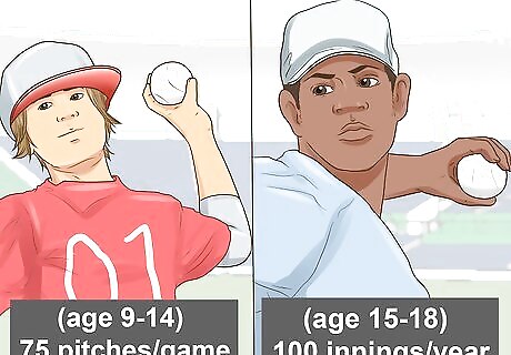 Abide by pitch and innings limits. There is no “magic number” of pitches, innings, or rest time that guarantees prevention of arm soreness or injury. That said, increased awareness has led to common-sense (or even rule-defined) limits being established in youth leagues right up to the pro leagues. Know the limits for your league/level, and follow them. Recommendations and restrictions can vary, but some experts say that youth pitchers (age 9-14) should never throw more than 75 pitches in a game (or 90 if age 15-18); should not throw more than 600 pitches (age 9-14) or 100 innings (age 15-18) per year; and should not pitch in more than two games per week. You'll have to personally keep track of pitches, innings, and rest between outings if you or your child is playing in multiple leagues (such as a high school team and a travel team) at once. Generally speaking, it is best for kids to avoid pitching on multiple teams in overlapping seasons anyway.