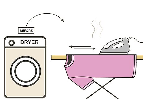 Take the fabric out just before the cycle is done, alternatively. This is another way to ensure that the fabric does not wrinkle or form creases. Take the fabric out of the dryer while it is still slightly damp. Then use an iron to press the fabric and finish drying it. Don't bother ironing the fabric if you're not going to use it right away, however, since storing it will cause creases.