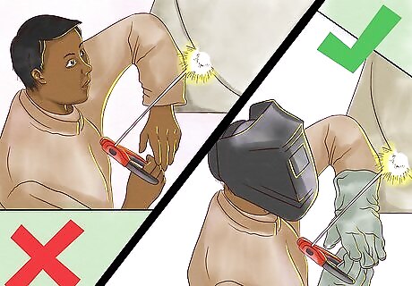 Wear proper eye protection wherever occupational sources of UV radiation are used. Industry and commercial use of machinery that produces UV radiation can quickly and significantly damage your eyesight. For this reason, businesses and unions have strong, specific regulations about the required protection to use in these environments. Follow these regulations at all times. In particular, goggles (usually built into a face shield) should be used whenever you’re welding. Whatever the eye wear used at your place of work, it should fit snugly to your face, with no gaps through which UV radiation might reach your eyes. Protective equipment for these types of uses should be designed specifically for this use. Do not use anything else for this purpose.