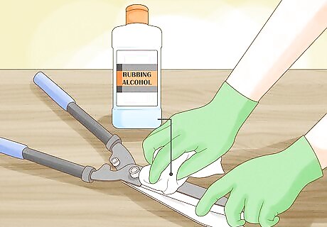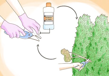 Sanitize your pruners before and during trimmings. Before and after using your pruners to snip away at evergreen branches, you should wipe them down with a rag moistened with rubbing alcohol. This will remove dirt and sap, and also sanitize them so that you don’t inadvertently transfer any evergreen diseases. To be extra safe, also wipe down your pruners when moving from one tree to the next. When you’re cutting branches that may be diseased, you should wipe down your pruners after every snip.