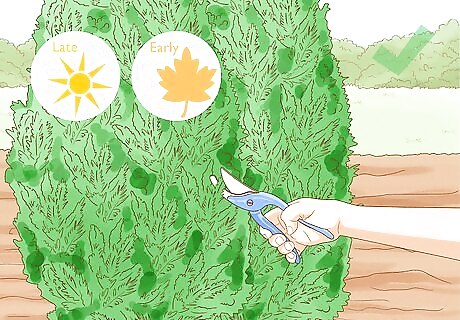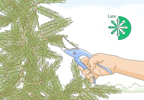 Limit your pruning during the late summer and early fall. If you prune an evergreen late in the growing season, you might inadvertently spur new growth just as the typical dormant season begins. Especially in colder climates, this fragile new growth will not survive, and its death may cause more widespread damage to the evergreen tree. Seasonal pruning only involves trimming for size or shape, though. You can remove dead, diseased, or damaged branches at any time. In most cases, spring—and often early spring—is the best time to prune evergreens. Late fall pruning is also usually OK, and there is often a period in midsummer when evergreens go semi-dormant—you can also do some pruning then.