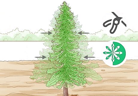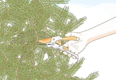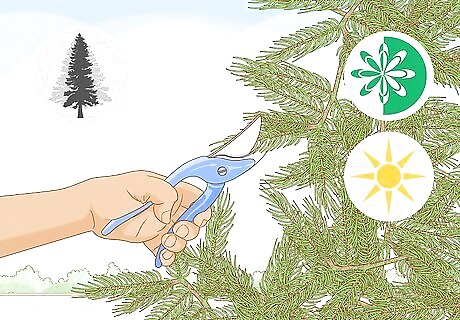Shear for shaping in late spring. If you really want to control the overall shape of a fir or spruce you can shear it—that is, cut off the ends of many branches to achieve a desired shape. It’s best to shear in late spring, once the new growth has emerged more fully and is less fragile. Only try to make minor shape adjustments through shearing, though, as opposed to major reshaping of a fir or spruce. Otherwise, you’ll likely end up with bare or dead spots. You can use handheld hedge clippers for shearing, but make sure to sanitize them with rubbing alcohol before and after using them.