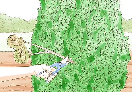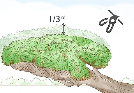 Remove up to two-thirds of new growth to control their size. Random branch evergreens like junipers, arborvitae, yews, and hemlocks usually sprout new branches with flat needles during the spring. You can prune them for size once or twice annually, but you should leave behind at least one-third of new growth during each pruning. The needles on areas of new growth tend to be softer and lighter in color. Leaving some new growth behind is beneficial for the health of the evergreen.