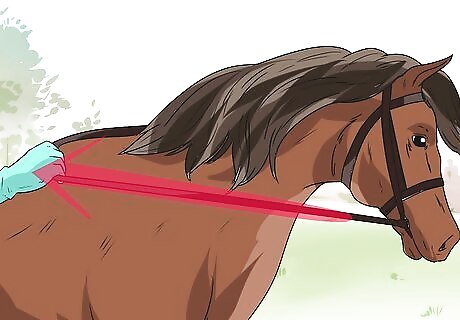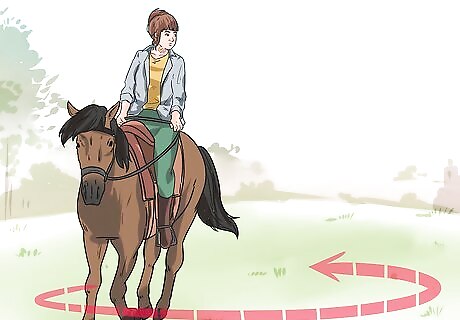 Try a pulley rein. This is one strategy that you should only use slowing a running horse. It works by applying leverage to the horse's mouth. Tighten the rein in your non-dominant hand so that it has no slack. Your hand should be centered on the horse's main with your knuckles against the horse and the rein completely taut. This will prevent the horse from jerking his head away from you. Keeping a tight grip with your non-dominant hand, lean forward as far as you can on the horse's neck and reach up on your dominant side and grab the rein as close to the horse's mouth as you can reach. Pull back with your dominant hand as hard as you can, using all of your body weight and leaning back into the saddle. This pulls the horse's head down and forces a stop. Ease your hold on the reins as soon as the horse stops or you risk the horse falling over and crushing you.