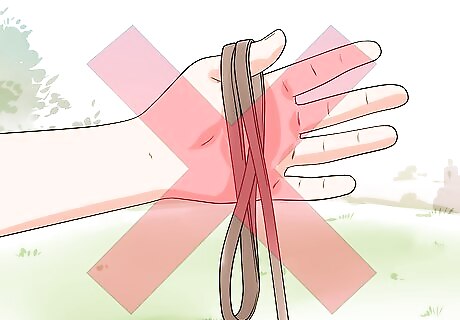 Never wrap the reins around your hand. Although it seems like this would increase your grip and make you less likely to fall, it can also lead to a severed or disjointed hand if there is a true emergency. Hold the reins securely with one hand, and hold the saddle horn with your other hand. NEVER let go of the reins and horn while riding. Wearing riding gloves can increase your grip on the reins and make it less likely that they will slip from your grasp.