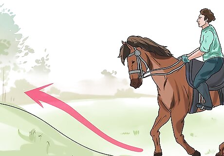 Aim for steep upward slopes if you can. Horses can't run fast uphill, so doing this will slow the horse's run and help you regain control. Avoid downhill if you can. It is jarring and can unseat you, and can cause a horse to tumble.