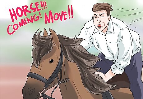 Stay alert. Just as you should do while driving a car, an alert horseback rider should stay alert and constantly rehearse scenarios in her mind of what she would do in case of emergency. As you ride, think about what you would do if your horse suddenly bolted at any given point in the ride. Watch your surroundings for safe routes, avoiding areas that would be hazardous if your horse suddenly bolted (for example, avoid riding your horse near vehicular traffic or near cliff edges).