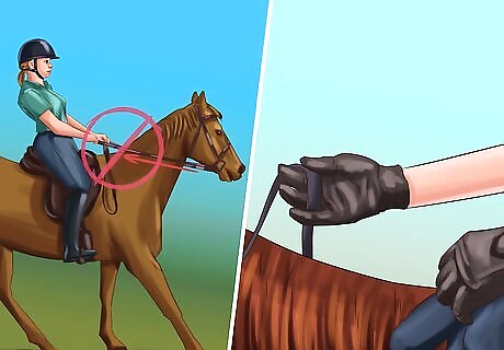 Don’t pull back on the reins. Often, when a horse rears the rider is taken by surprise and she loses her balance. This will prompt her to lean back in the saddle and pull back on both of the reins to try to hang on. This can be dangerous and can cause the horse to be pulled off-balance, potentially falling over backwards and hurting you and the horse. If you pull on both reins, the horse may also try to fight your hold. This will only make him more nervous and trapped, and will exacerbate the situation.