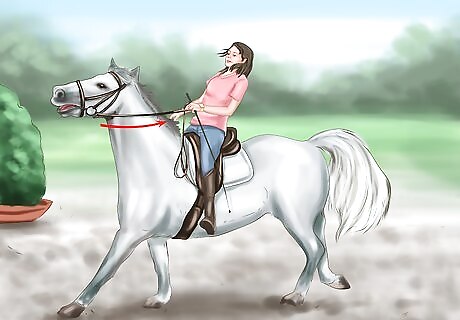 Yield his hindquarters. If your horse is afraid and that is what’s prompting him to rear, you can tackle this by yielding his hindquarters. This means making him cross over his back legs so he loses his balance point, and has to think about how he is moving his feet rather than whatever is frightening him. When he loses his balance point, he also cannot stand up on his hind legs to rear. To do this, pull one rein around to your hip, so you bring his head around towards your toe on one side. Put your leg (the one that you are drawing him towards) back, and apply a little pressure to his flank. When he responds to the pressure and moves the way you are directing him, release your leg. When he has softened to the rein by giving to the bit, and noticeably softening his jaw and neck, you should release the rein.