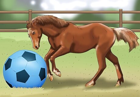 Desensitize an anxious or fearful horse. If your horse is particularly sensitive or anxious, certain stimuli may prompt him to rear. You can work on addressing this by progressively desensitizing him to the things which provoke anxiety. The basic technique for desensitization work is to expose him the stimulus in a safe environment, and wait for him to stop reacting. When there is no reaction to the stimulus, remove it and praise the horse. Wait a few seconds and then reintroduce the stimulus. Repeat this over and over. Remember not to remove the stimulus until there is no reaction from your horse.