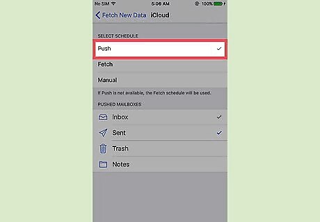 Select Push. Now when someone sends an email to your iCloud email address, it will be “pushed” to your phone as soon as it's received by the server. If you organize your mail with iCloud filters, you can choose not to push a certain mailbox by deselecting it under “Pushed Mailboxes.” Your iPhone can only receive pushed data when it's connected to the Internet.