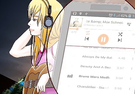 Listen to a favorite song. Studies have found that listening to music you like can alter your mood and alleviate depression. Create a playlist if you have the means and include uplifting, positive songs. Listen to this song as an example of one you could use, Smile Please by Stevie Wonder