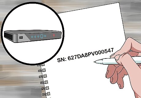 Find out your DirecTV receiver's serial number. In order to utilize DirecTV's recycling service, you'll need to find out your receiver's serial number. The serial number will be located on a sticker on the back or bottom of your receiver. The serial number is usually preceded by “SN:” and includes a letter and 2 numbers. Write your serial number down to use later when filling out your mailing label. You can also find out your serial number before you disconnect your receiver from your television. You can either check your equipment information online or access your DirecTV settings on your TV. To access your settings on your television, press and hold the “Info” button on your DirecTV remote. Your receiver's serial number will be listed on the “Info & Test” screen on the line labeled “Receiver.”
