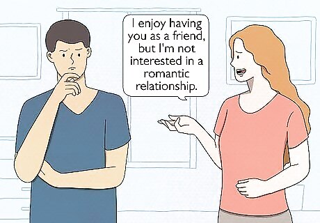 Directly tell them “no.” It's normal to want to gently let down a friend, but the only way to make it clear how you feel is to use the word no. Telling them that you don't think that it would work out, that you aren't right for each other, or that you aren't ready for a relationship right now will leave the door open for future possibilities. This can lead to more advances and hurt feelings. It's best to leave out any ambiguity. Say, “I enjoy having you as a friend, but I'm not interested in a romantic relationship.” Don't add conditions to the no. For example, don't say, “I'm already seeing someone.”