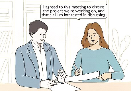 Tell them that you aren't interested. Sexual advances at work can be tricky since they can come from a boss, client, or coworker, any of which can put your career in jeopardy. Make it clear that you aren't interested in their advances. Be firm, then transition back to work topics. This technique can redirect their attention without seeming rude. Say, "I agreed to this meeting to discuss the project we're working on, and that's all I'm interested in discussing.”
