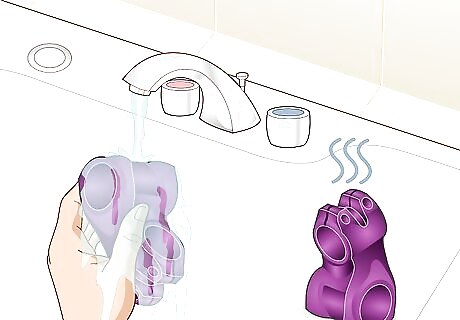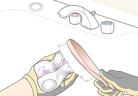 Rinse the metal off under warm water to remove the cleaner. Carry it over to your sink and wash it thoroughly. Make sure all of the cleaner is gone so it doesn’t continue eating into the metal. Also, watch for anything dripping off of the metal. Be sure to wipe up moisture and rinse off anything that gets splashed so it isn’t affected by the cleaner. If you don’t want to use your sink, fill a bucket with warm water. You could use a plastic paint bucket, for instance.