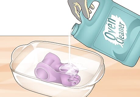 Fill the container with enough oven cleaner to cover the part. Purchase a heavy-duty oven degreaser. It usually comes in a spray bottle. To use it, spray it directly into the container until you are no longer able to see the metal inside of it. You can’t really use too much, so make sure that the metal is well-covered. If you’re stripping multiple parts at the same time, keep them separated. The cleaner may not be able to reach any spots where they are touching. Other strong chemicals, such as rust removers and drain cleaners, also do a good job of removing anodization.