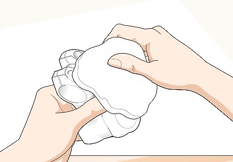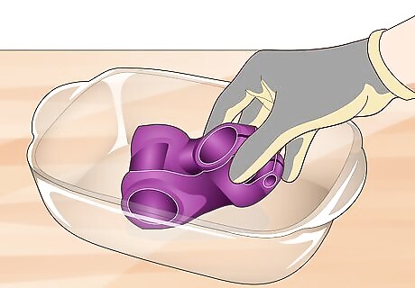 Select a clear glass container and place the part in it. Choose something old that you don’t mind exposing to a harsh chemical. Glass containers are the least likely to be damaged by the cleaner you will use, but the cleaner could still leave permanent stains on it. If you’re stripping a small part, a glass cup or bowl will have more than enough room. It needs to be deep enough to submerge the part in the cleaner. If the part is too big to fit in a container, set it on top of a protective surface, such as a plastic drop cloth, and then spray it with the anodization remover. If you’re stripping multiple parts, make sure they all fit in the container without touching. Otherwise, use several different containers or treat them in batches. To avoid using a permanent container, you could make a temporary one out of plastic. For example, cut the top off a plastic bottle. Place the part in it and fill it with the cleaner.
