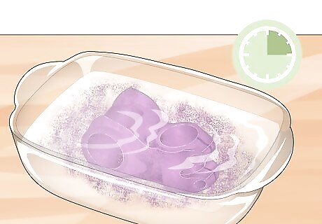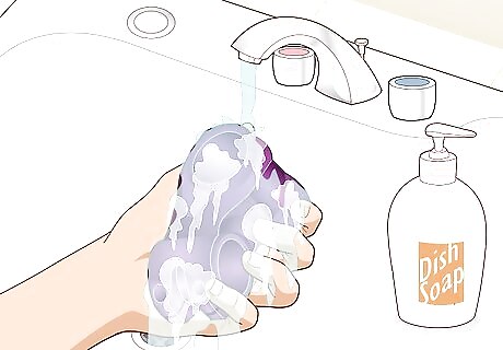 Wash the metal with soap and water to remove any remaining debris. Place it in your sink under warm water. You can use your regular dish soap to clean it. Try mixing about 2 tablespoons (30 mL) of soap into 1 cup (240 mL) water. Then, scrub the metal thoroughly to remove dirt, adhesive residue, and any other debris left over. Remember that the debris could prevent the coloring from coming off evenly. Make sure the metal is as clean as you can get it.