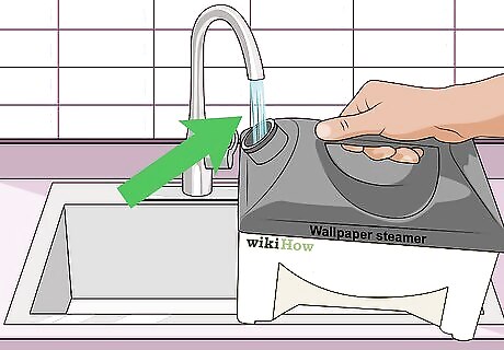 Fill the wallpaper steamer with water. Fill the steamer canister with hot tap water. Plug the machine into a wall outlet and switch it on, giving it several minutes to heat up. Each steamer may work differently, so follow the manufacturer's instructions before use. If the water canister has a fill line, make sure that you do not fill it above that line. Give the machine an adequate amount of time to heat up, too.