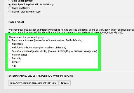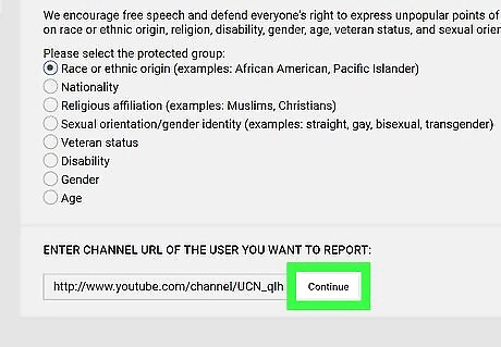 Fill out the form(s). This is where you'll have the opportunity to add details about your reason for reporting this channel. The options will vary depending on the reason you selected. Once the form is filled out, the channel's URL will appear at the bottom of the screen with a "Continue" button.