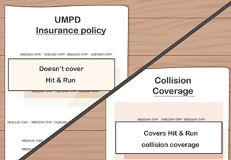 Check if your insurance covers the damage. In a normal accident, you would get the other driver’s insurance information and their insurer would pay to have your car fixed. However, because you don’t know the driver, you need to check whether your own insurance will cover the cost of a hit-and-run. Collision coverage will typically cover damage from a hit-and-run. Collision insurance pays for any damage caused when your car hits another object. Alternately, you could have uninsured motorist property damage coverage (UMPD). However, UMPD is not available in all states, and in some states it does not cover hit-and-run damage. For example, UMPD will not cover a hit-and-run in California, Colorado, Georgia, Illinois, Louisiana, or Ohio. In these states, you will need collision coverage.