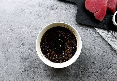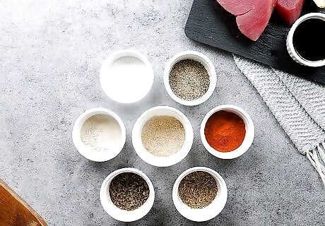Create a blackened tuna rub. In order to make a blackened tuna rub, combine paprika, oregano, thyme, black pepper, onion powder, garlic powder, and salt in a bowl. Taste the seasoning and adjust the quantities when you reach a flavor you enjoy. You can search online to find a recipe for a delicious tuna rub or experiment with the spices and herbs that you have on hand.