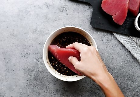Add tuna to the marinade. Once you have completed the marinade, add the tuna to the bowl or plastic bag. Dip the tuna entirely into the liquid marinade, so that all sides of the steak are coated.