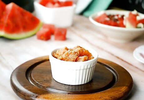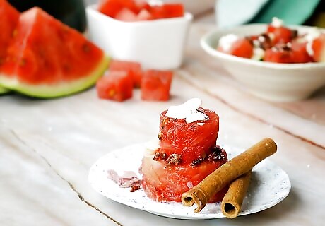 Make deep-fried watermelon. This tasty, but not-so-healthy treat is often served at county fairs and other events. Finished with some powdered sugar, it makes a decadently juicy treat!