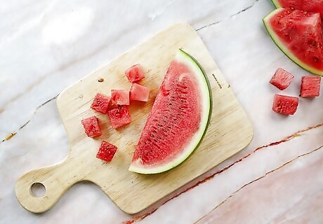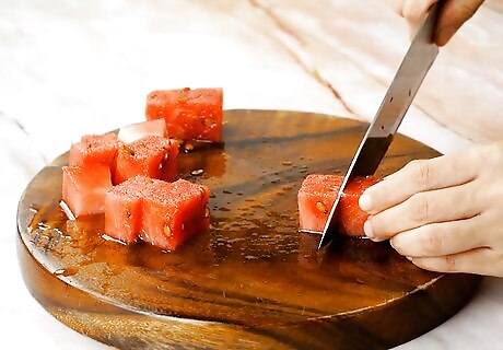 Cut the watermelon. To cut your watermelon into bite-size chunks, first place the watermelon on a chopping board and cut off the top and bottom using a sharp knife. This will allow you to securely stand the watermelon on one of the cut edges. Run the blade of the knife down the sides of the watermelon, cutting the rind from the flesh. Next cut the watermelon into round disks, then cut the disks into 1-inch cubes. If not using immediately, place the cut watermelon in a covered container and refrigerate. It will keep like this for 3 to 4 days.