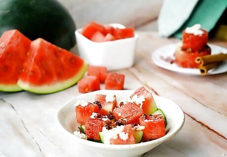 Make watermelon salad. Watermelon is the perfect addition to a fresh salad, giving your lunch an added, juicy crunch. This recipe pairs watermelon with cucumbers, cashew nuts and feta cheese!