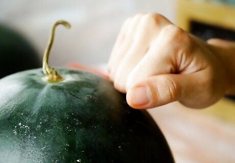 Try the tapping technique. The tapping technique can be a little hard to master, but many watermelon fans swear by it. Give the watermelon a firm grip with your knuckles and listen to the sound it makes. For a ripe melon, you want a full sound, more tenor than base. You do not want a dull or deep sound, as this means the watermelon is unripe.