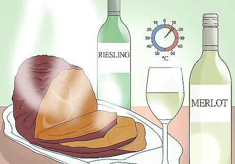 Serve a riesling or merlot with your ham. If you are serving ham for Thanksgiving, try to find a wine with some fruity tones that also has a hint of sweetness. A sweet riesling, a white zinfandel, or a merlot pair well with honey glazed hams. If you are serving smoked ham, you might want to consider a pinot noir or a zinfandel. Serve your riesling chilled (48°F/8°C) and your merlot slightly under room temperature (55°F/13°C to 60°F/15°C)