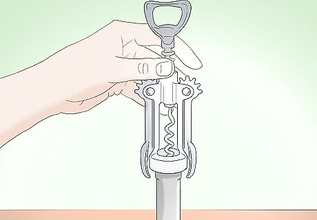 Remove the cork. There are many methods to opening a bottle of wine. You can use a sommelier knife, a shoe or even a hammer and nails. However, a corkscrew is the most common and the simplest means for opening a bottle and removing the cork. Simply screw the corkscrew into the cork and then pull it out. Try to place the corkscrew a little off center. This will prevent you from breaking the cork.