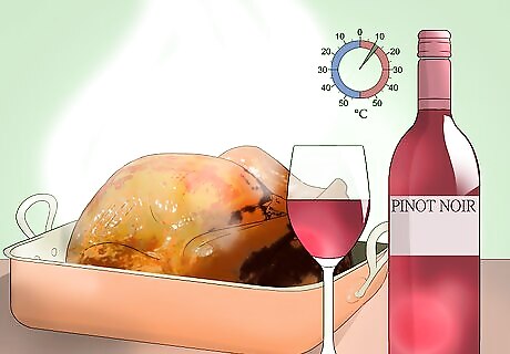 Pair a pinot noir with your turkey and side dishes. A low-acid, high-tannin pinot with hints of berry may be a good complement to your turkey. This is especially true considering how often people pair turkey with cranberries. For a great pairing, look for a pinot that comes from the Pacific Northwest or the Great Lakes area. Be sure to serve pinot noir slightly chilled (50°F/10°C to 55°F/13°C) Pinot noir can accompany most of your meat dishes.