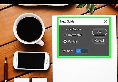 Select a position for the first guide line. Here’s how: Choose either Horizontal or Vertical in the “Orientation” section. Enter the ruler position (e.g. 12 cm) where you want the guide to appear. Don't worry, you can move guides around the workspace at any time. Click OK. The guide (a blue line) now appears over the workspace at the location you entered.